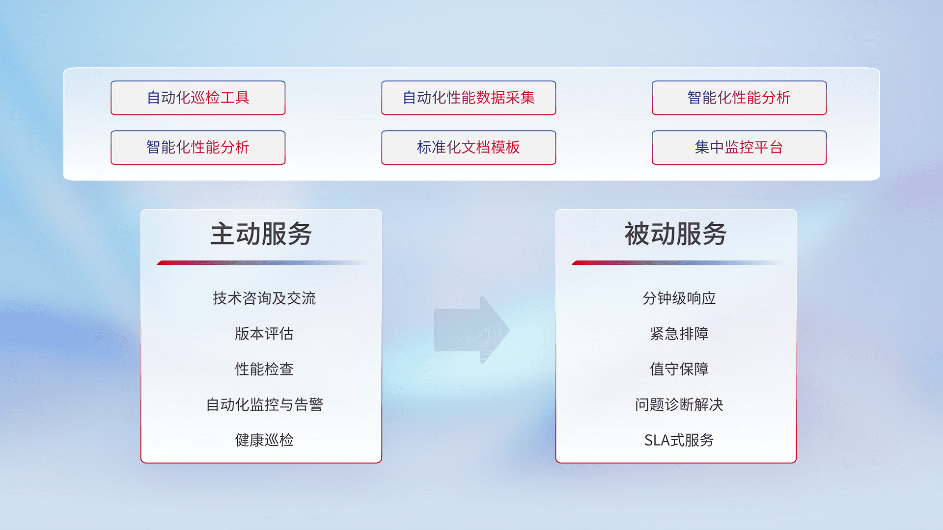 智能化工具和标准化文档,,,保障服务质量,,,,提供主动服务(包含技术咨询、、版本评估、、、、性能检查、、、自动化监控与告警、、、、健康巡检)和被动服务包含(分钟级响应、、紧急排障、、、值守保障、、、问题诊断解决、、SLA服务)。。